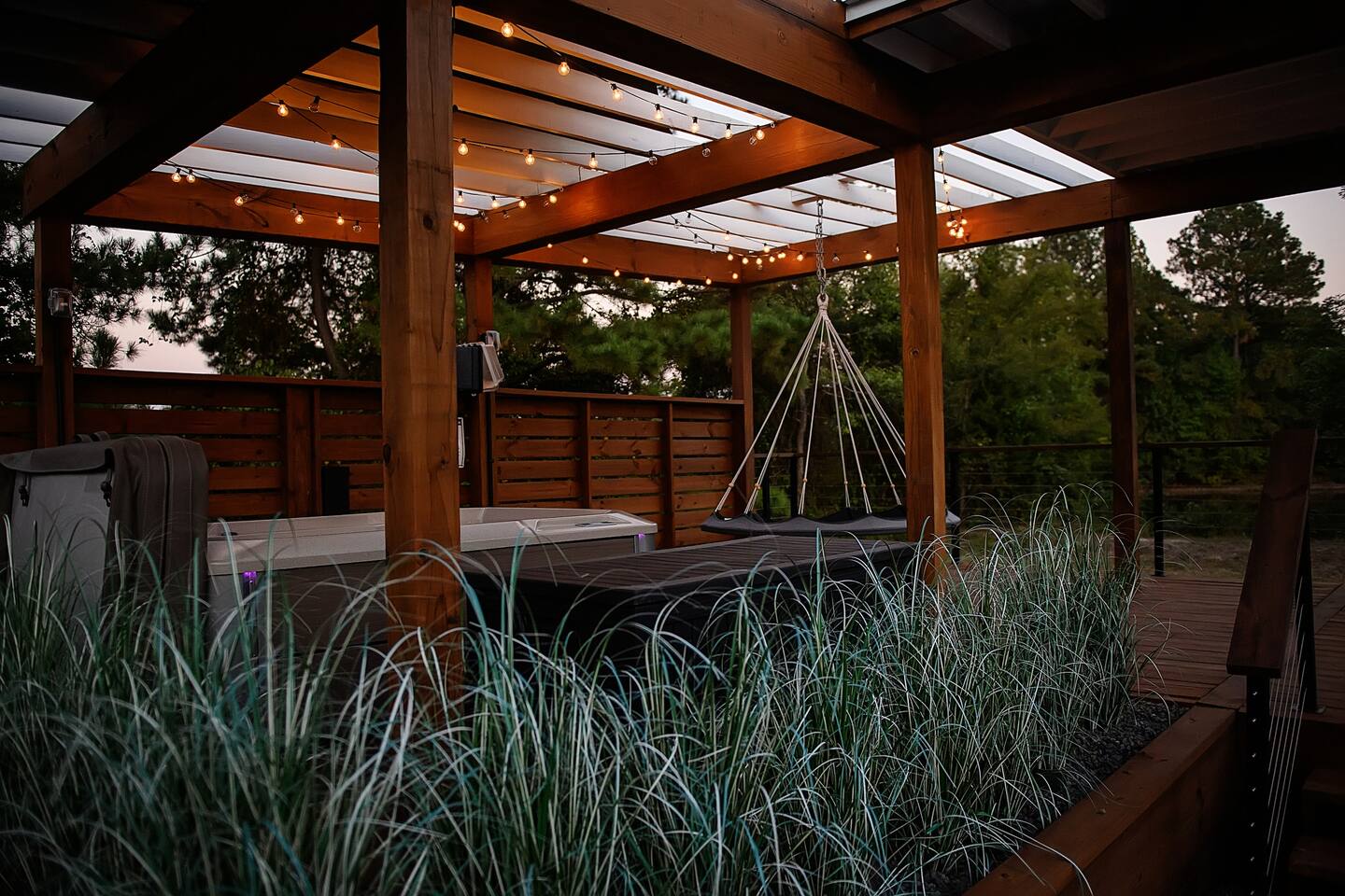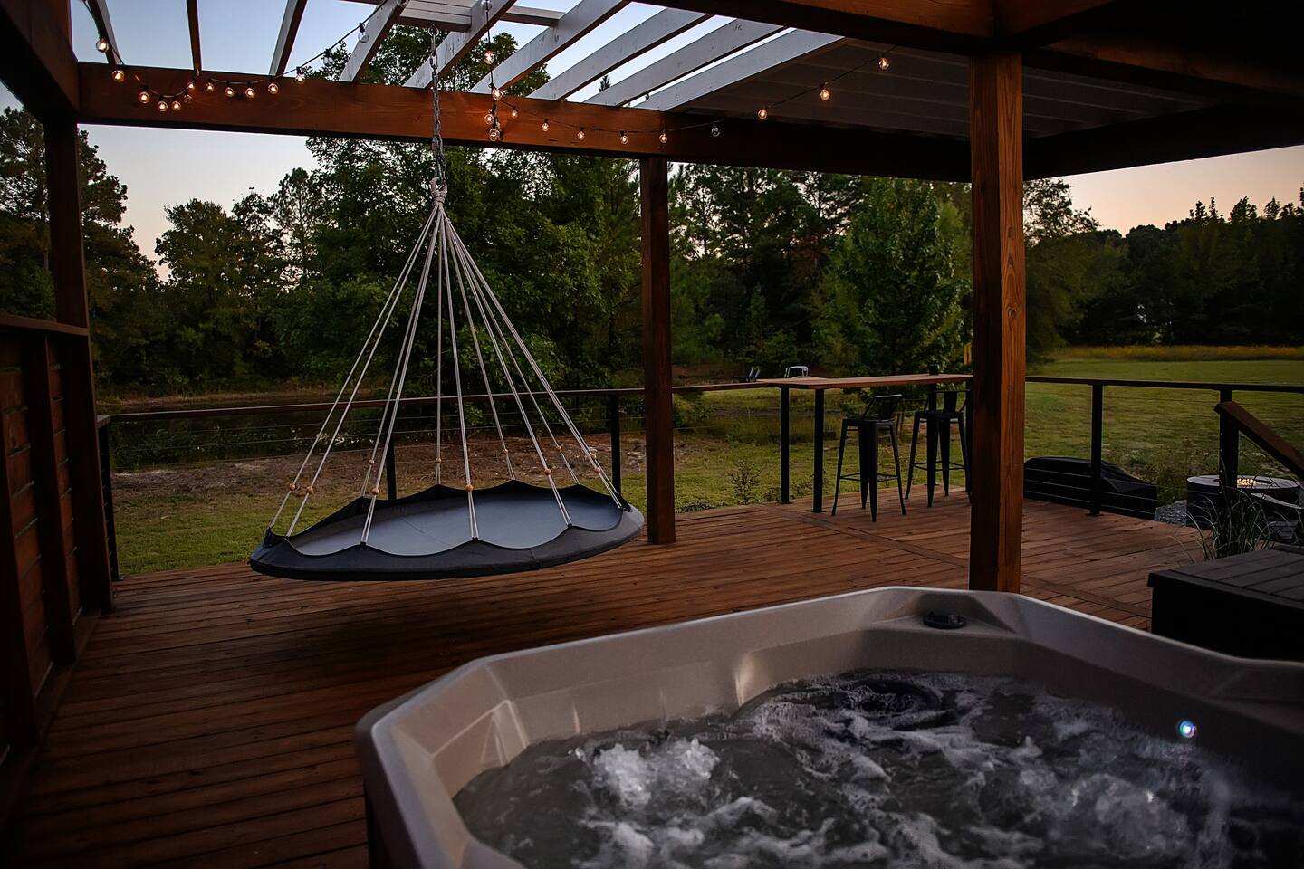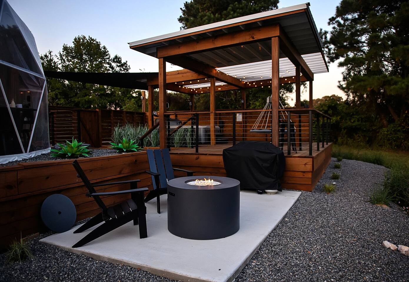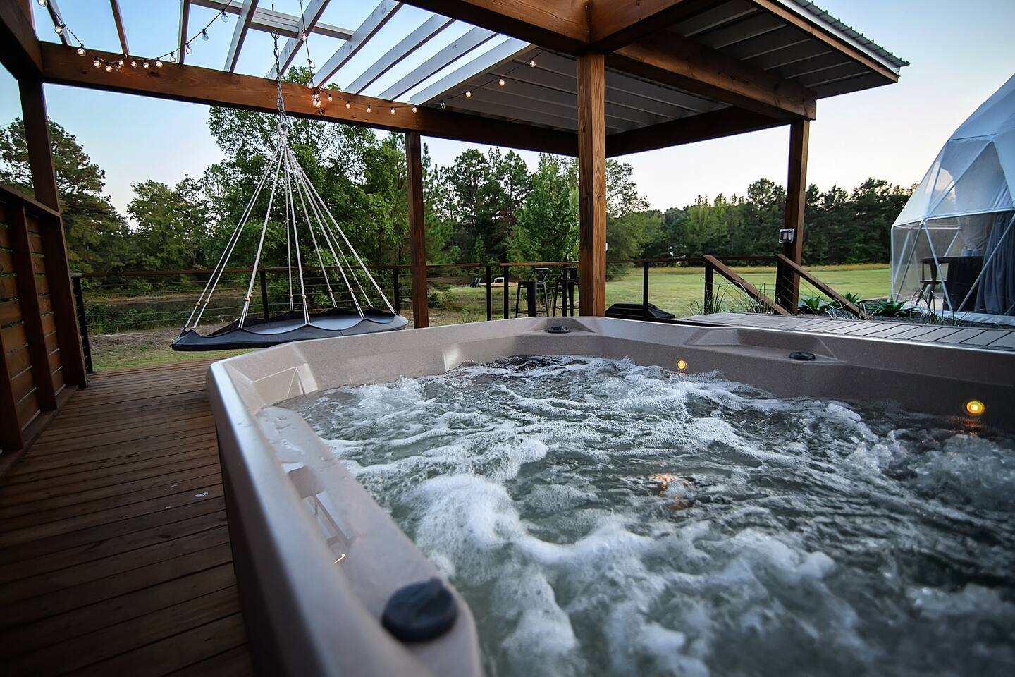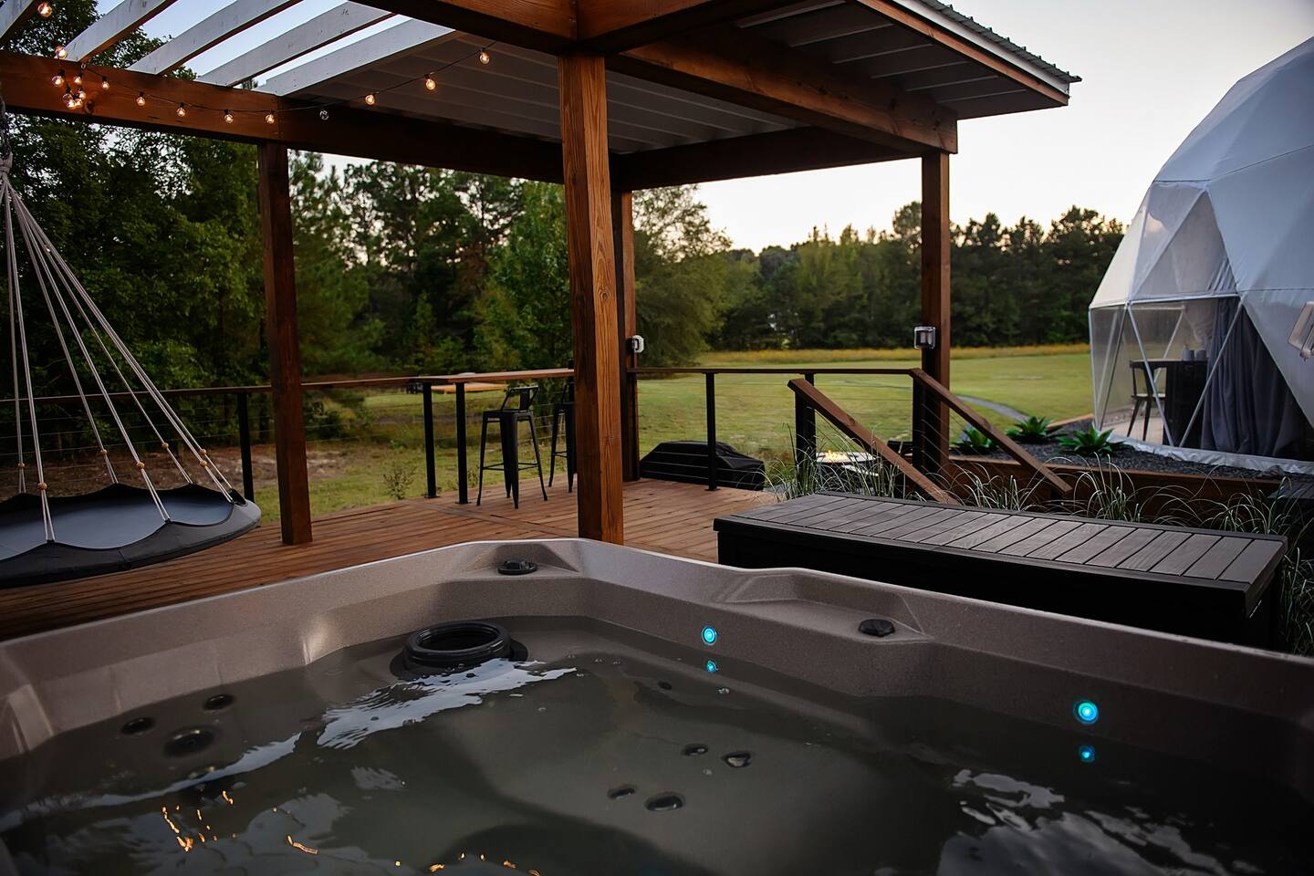 Welcome to Luna, one of our newly designed luxury geodesic dome tents at Moonlit Glamping. Luna sits on an elevated deck with stunning views of the property’s serene pond and the countryside of Pearcy, AR. This cozy retreat includes a private patio with a variety of outdoor amenities, including a hot tub, perfect for a relaxing and tranquil escape. Included is access to a shared commons area by the pond, featuring additional amenities to both Luna and our neighboring glamping dome, Sol.