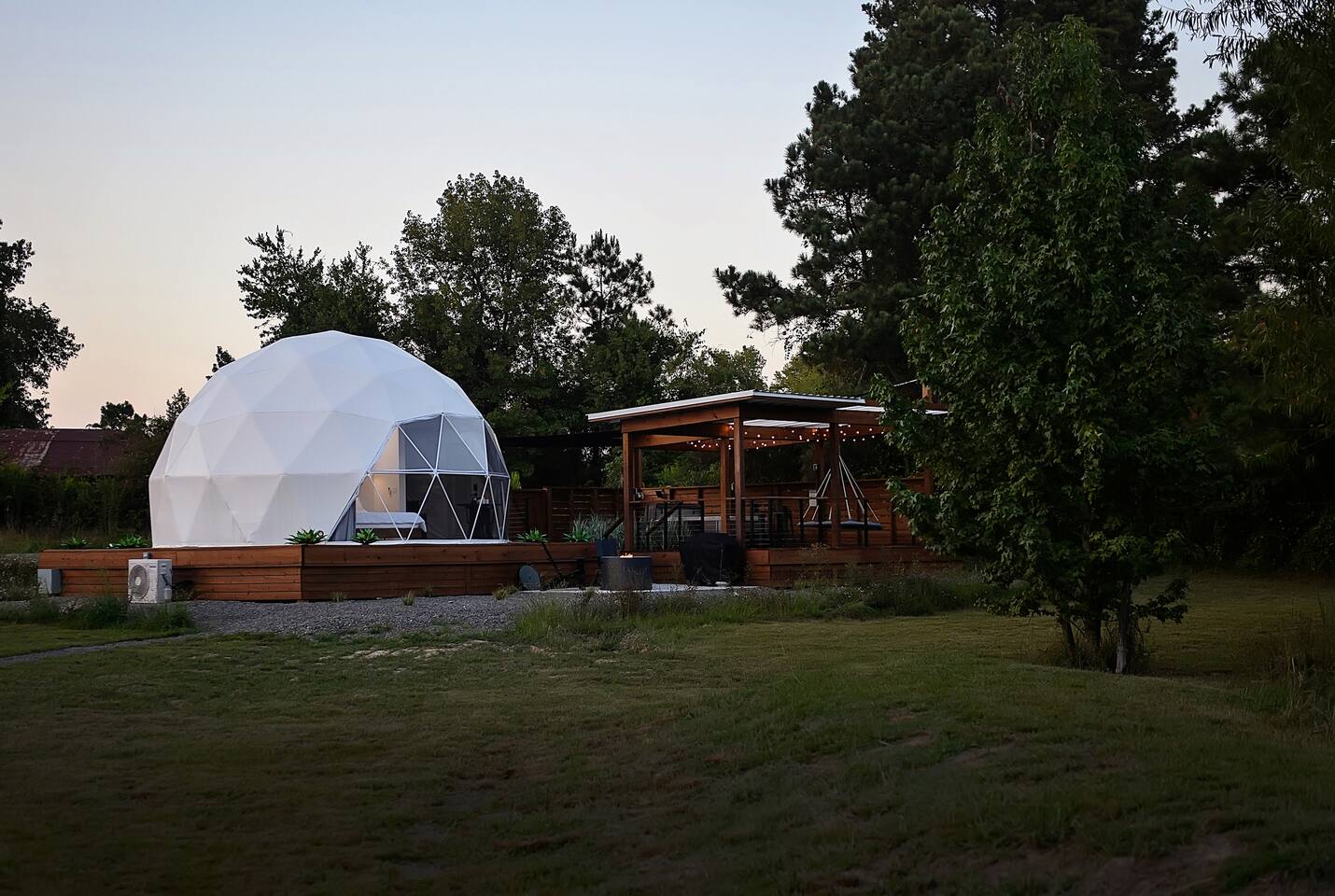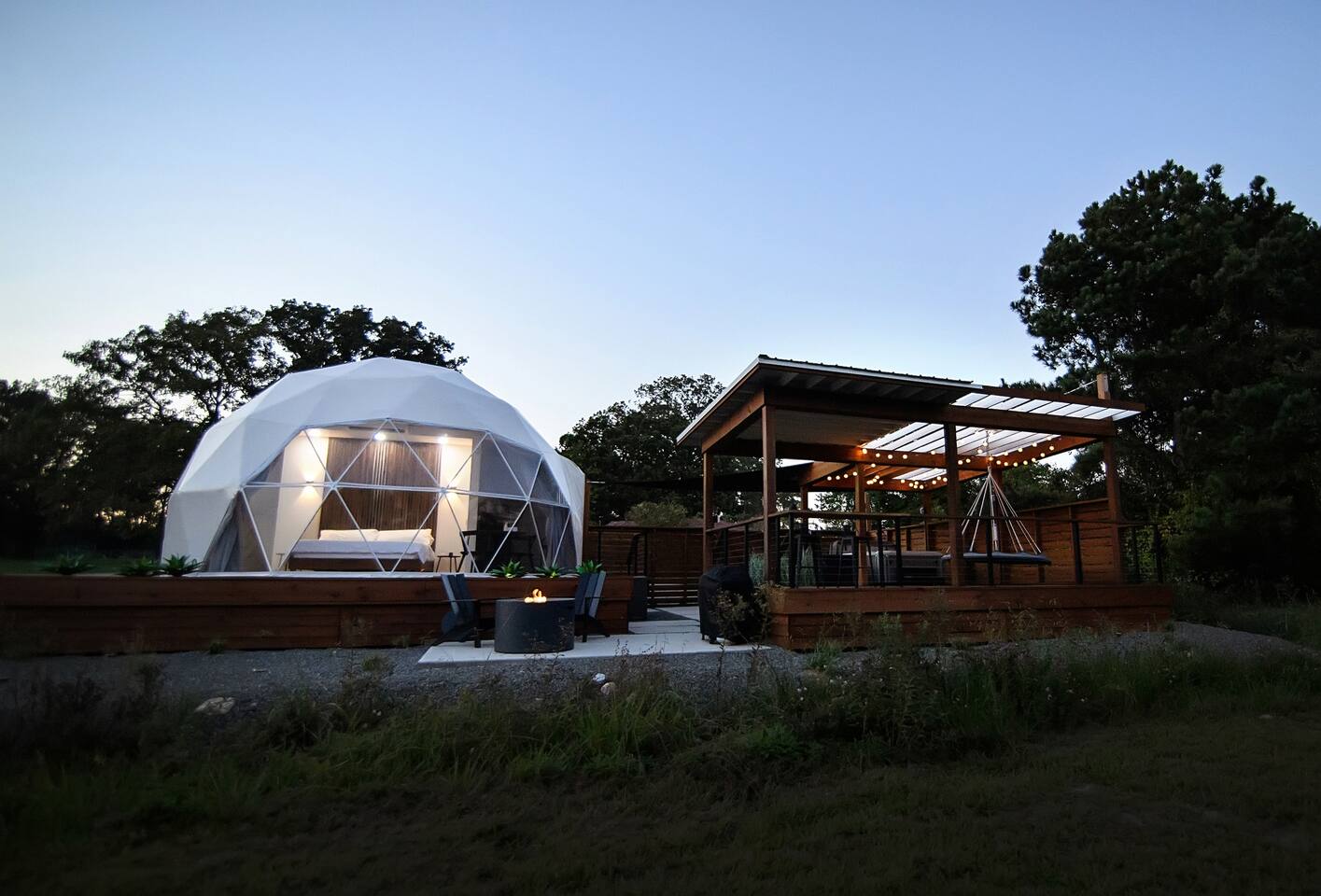 Welcome to Moonlit Glamping, containing our newly built Modern Scandinavian design geodesic dome glamping units Luna and Sol. Moonlit Glamping exuberates earthy tones, minimalistic design, and functional spaces with the goal of providing a relaxing and tranquil stay for our guests that connects one to nature. Luna, inspired by the moon and Sol, inspired by the sun, are similar in core design but exhibit color tones that uniquely distinguish one from another. The Geodesic domes are made with a galvanized steel frame, a thick canvas liner, and a huge clear vinyl bay window providing a unique experience for our guests. Moonlit Glamping is located on 17 acres of beautiful country land in the heart of Pearcy, AR. This lovely property was originally a farm where the land was used to grow a variety of crops and house livestock. It now resides as a quaint getaway for those looking to enjoy the countryside. Enjoy this unique stay with fabulous amenities while being close enough to all the fantastic attractions the surrounding area has to offer! Whether dipping your toes in one of the nearby lakes, taking a stroll through downtown Hot Springs, or immersing yourself in nature on one of the nearby hiking trails, you will find lots of attractions/activities in only an easy 40 mins or less away.